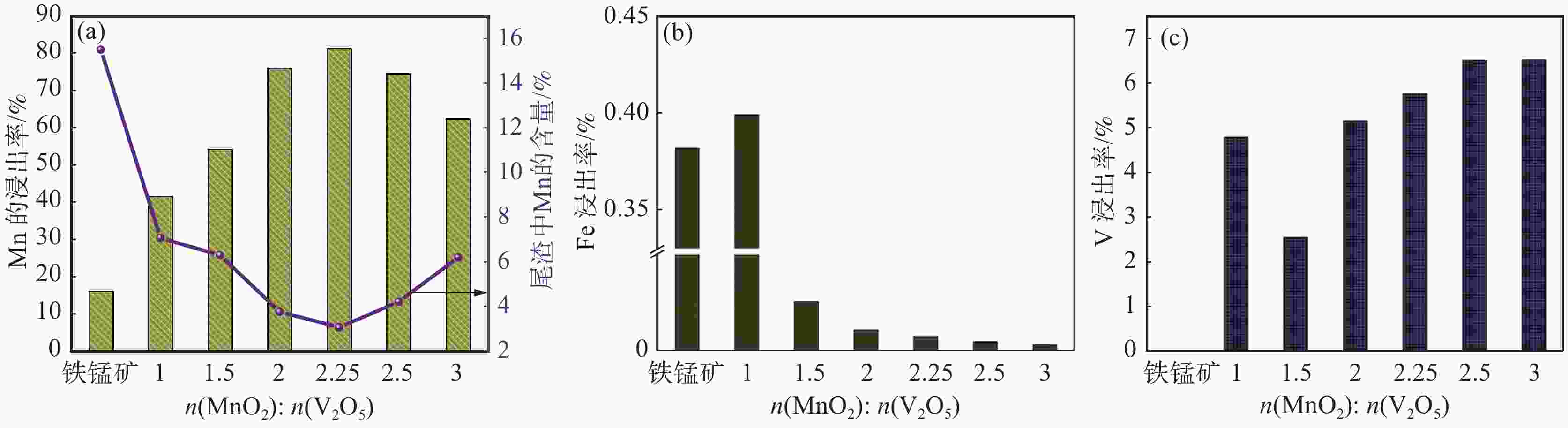 图  6  不同n(MnO2)/n(V2O5)下主要元素的浸出率及质量分数