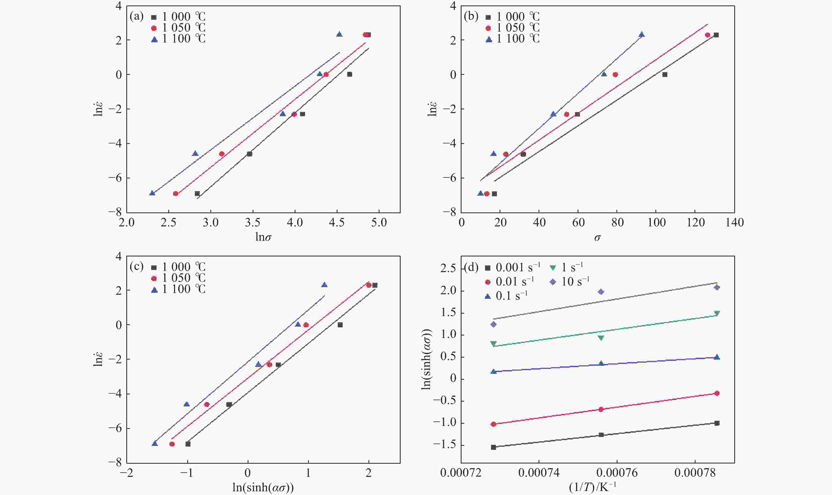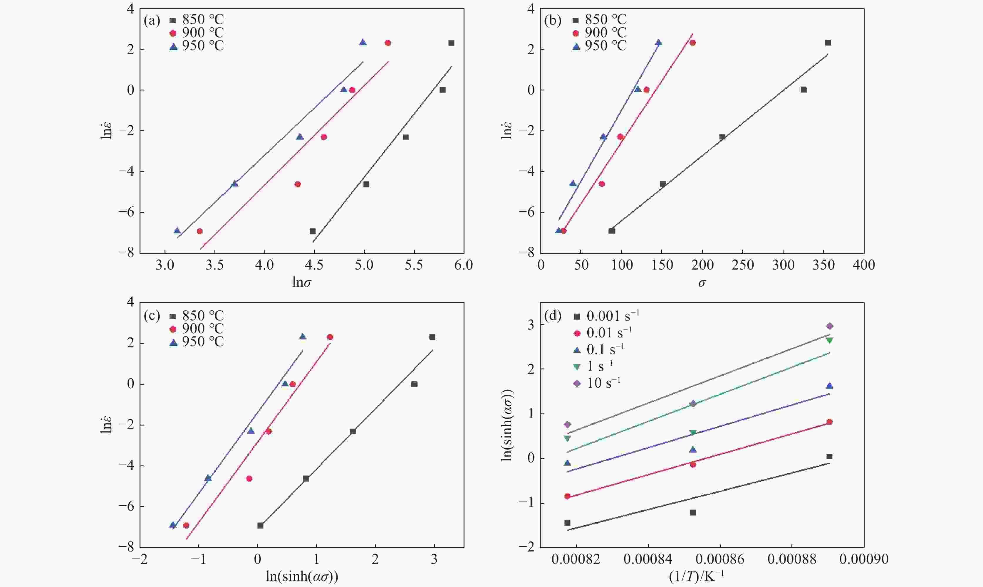 (a) ln$ \mathop \varepsilon \limits^ \cdot $-lnσ;(b) ln$ \mathop \varepsilon \limits^ \cdot $-σ;(c) ln$ \mathop \varepsilon \limits^ \cdot $-ln(sinh(ασ));(d) ln(sinh(ασ))-1/T