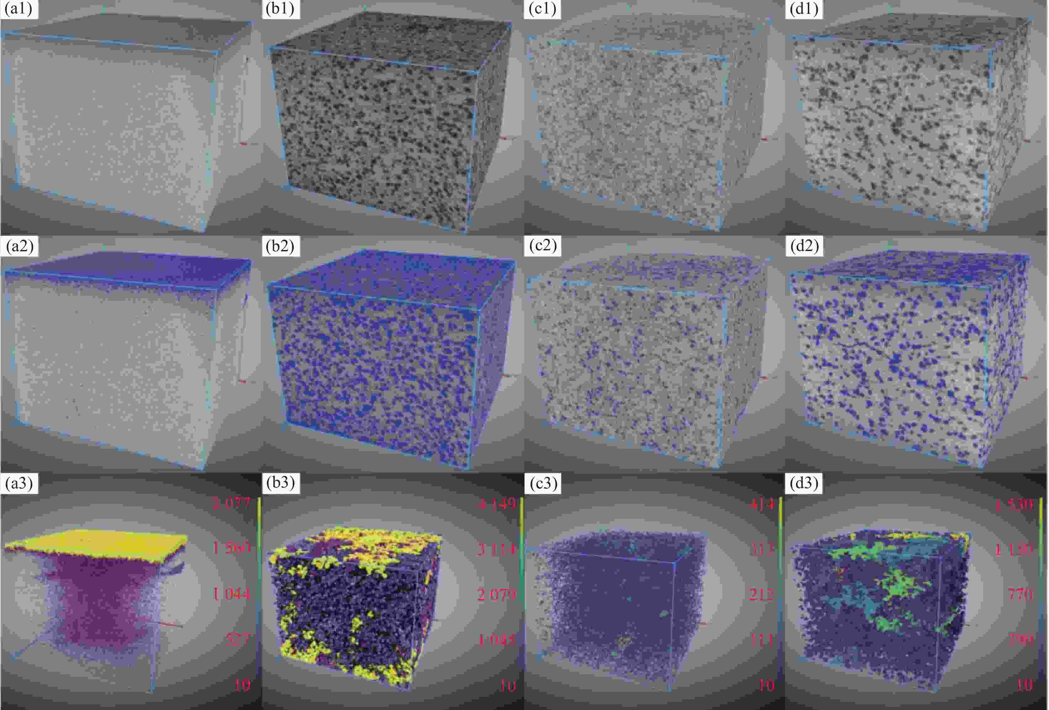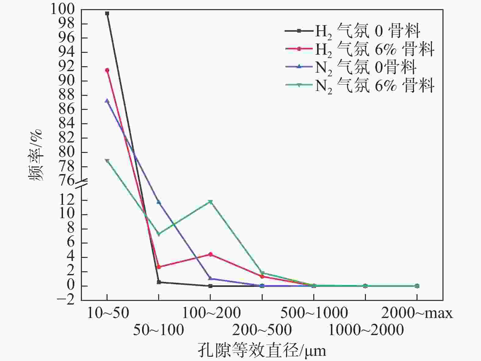(a1)~(a3)H2气氛0骨料;(b1)~(b3)H2气氛6%骨料;(c1)~(c3)N2气氛0骨料;(d1)~(d3)N2气氛6%骨料