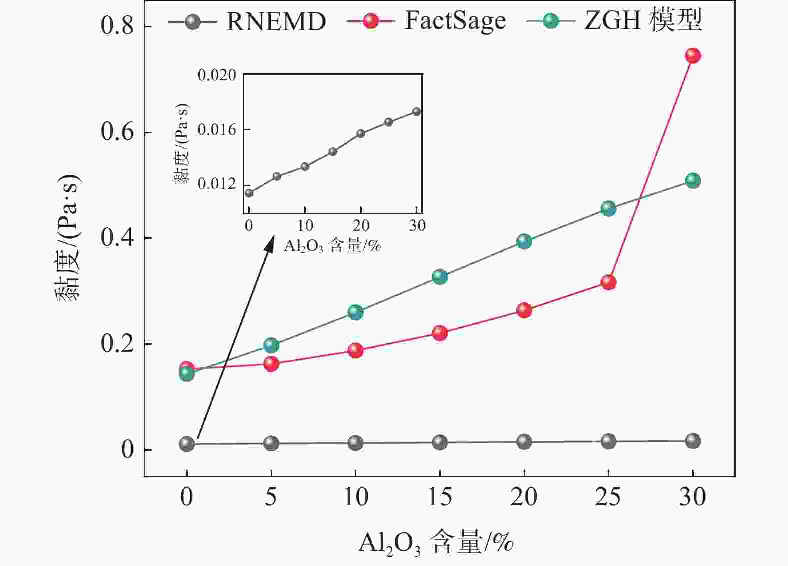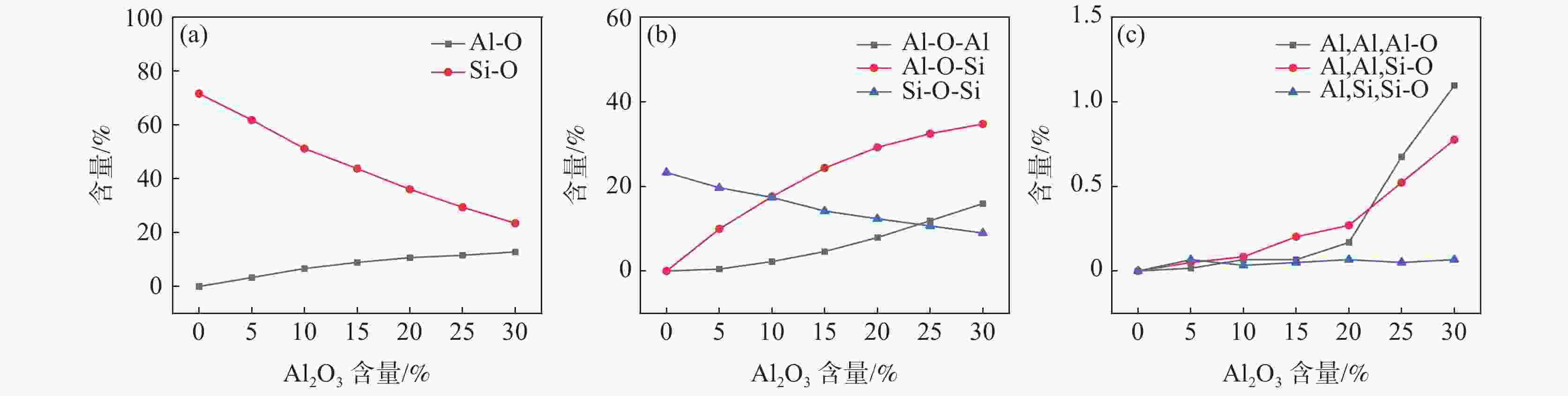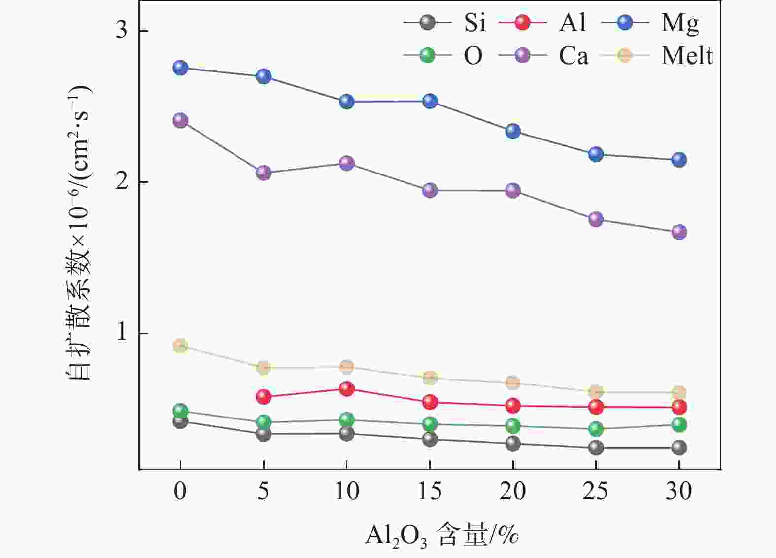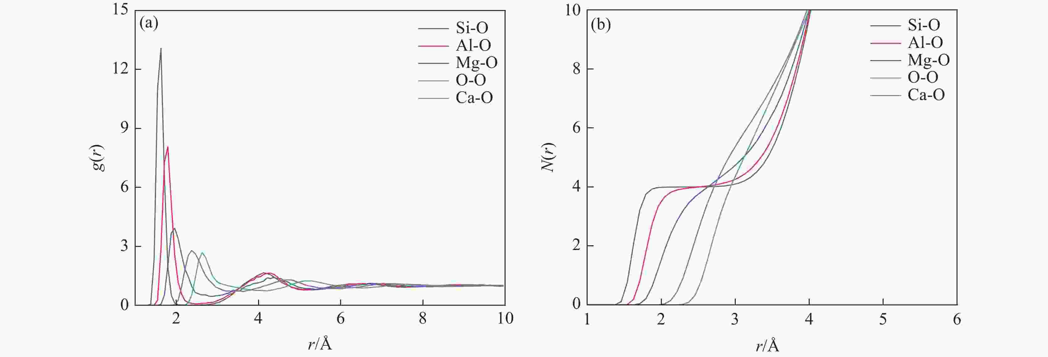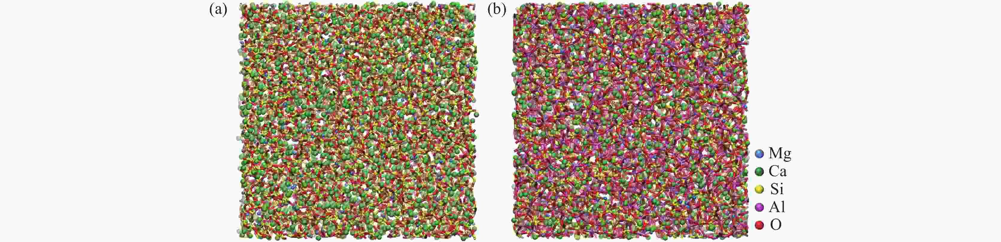 元素 原子有效电荷/e Buckingham势函数参数 Aij /eV ρij /Å Cij /eV·Å6 Si +2.4 13702.91 0.193817 54.681 Al +1.8 12201.42 0.195628 31.997 Ca +1.2 7747.183 0.252623 93.109 Mg +1.2 7063.4907 0.210901 19.210 O −1.2 2029.22 0.343645 192.58 注:1 Å=0.1 nm 表 1 渣系成分