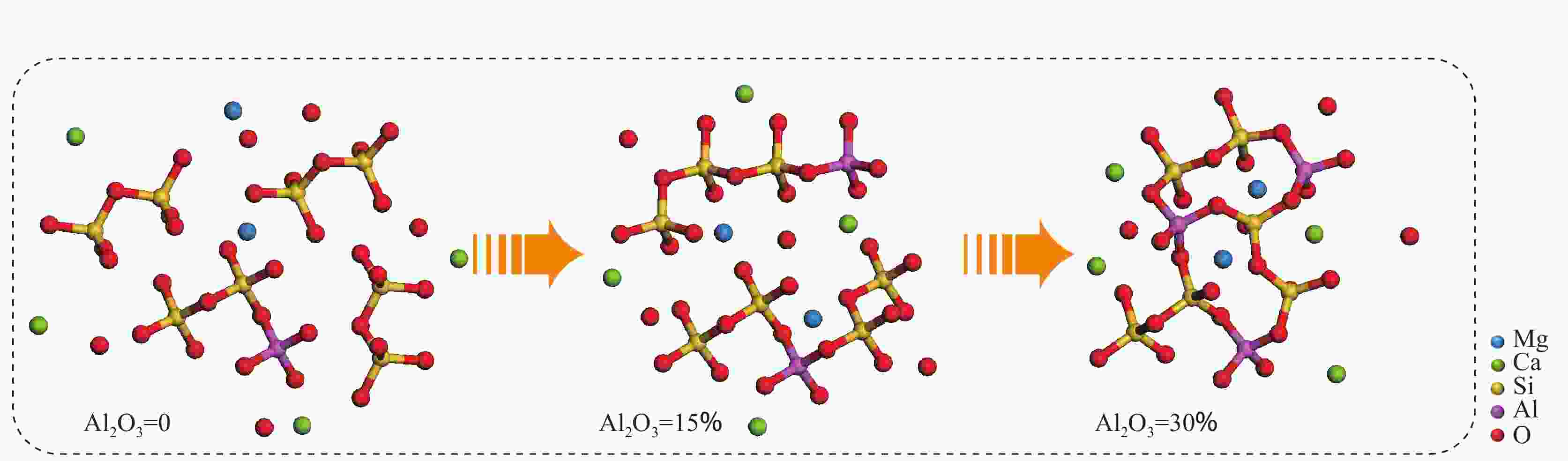 探讨了低碱度精炼渣系CaO-MgO-Al2O3-SiO2中Al2O3含量对其微观结构和性能的影响。采用分子动力学模拟方法,系统地分析了不同Al2O3含量对低碱度精炼渣系的微观结构与性质的影响。结果表明,Al2O3含量的增加对体系的径向分布函数、配位数和键角等无明显影响,但显著降低了体系的FO和NBO含量,强化了体系的网络结构。此外,Al2O3含量的增加使渣系中元素的扩散能力降低,扩散能力的顺序为Mg2+>Ca2+>Al3+>O2−>Si4+。随着Al2O3质量分数的增加,渣系黏度逐渐增大,这与扩散系数的变化趋势相反。该结果建立了低碱度渣系结构与性能之间的联系,为非铝脱氧工艺采用适合的低碱度渣提供了理论支撑。