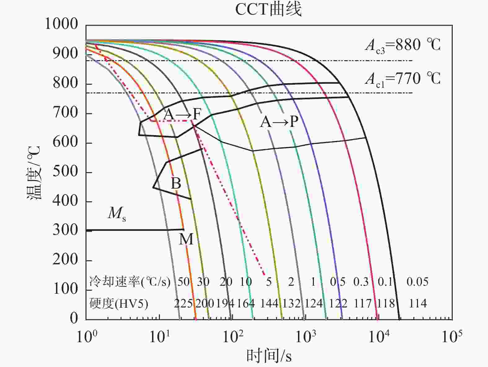 测定了DP600 钢的 CCT 曲线,在不同层流冷却工艺下对该钢进行工业试生产,研究了冷却速率、空冷温度和卷取温度对其组织性能的影响。结果表明:当冷却速率 < 10 ℃/s 时,DP600 钢发生珠光体相变;当冷却速率为 ≥10 ℃/s 时,DP600 钢发生贝氏体相变;当冷却速率 > 20 ℃/s 时,DP600 钢发生马氏体相变。随着空冷温度由 700 ℃ 降低到 620、500 ℃,试验钢的显微组织分别为铁素体加马氏体、珠光体、贝氏体,抗拉强度先降低后升高。随着卷取温度由 500 ℃ 降低到 200 ℃ 以下,试验钢的组织由铁素体加珠光体变为铁素体加马氏体,且卷取温度低于100 ℃以下时,马氏体呈条带状偏聚分布,进而导致延伸率和冷弯性能不合格。空冷温度 700 ℃、卷取温度 200 ℃ 时,DP600 钢的力学性能满足要求,此时组织为75% 的铁素体加 25% 的马氏体,平均晶粒尺寸 (8.5 ± 0.3)μm,屈服强度 (397 ± 9)MPa,抗拉强度( 659 ± 13)MPa,延伸率 27% ± 1.1%。