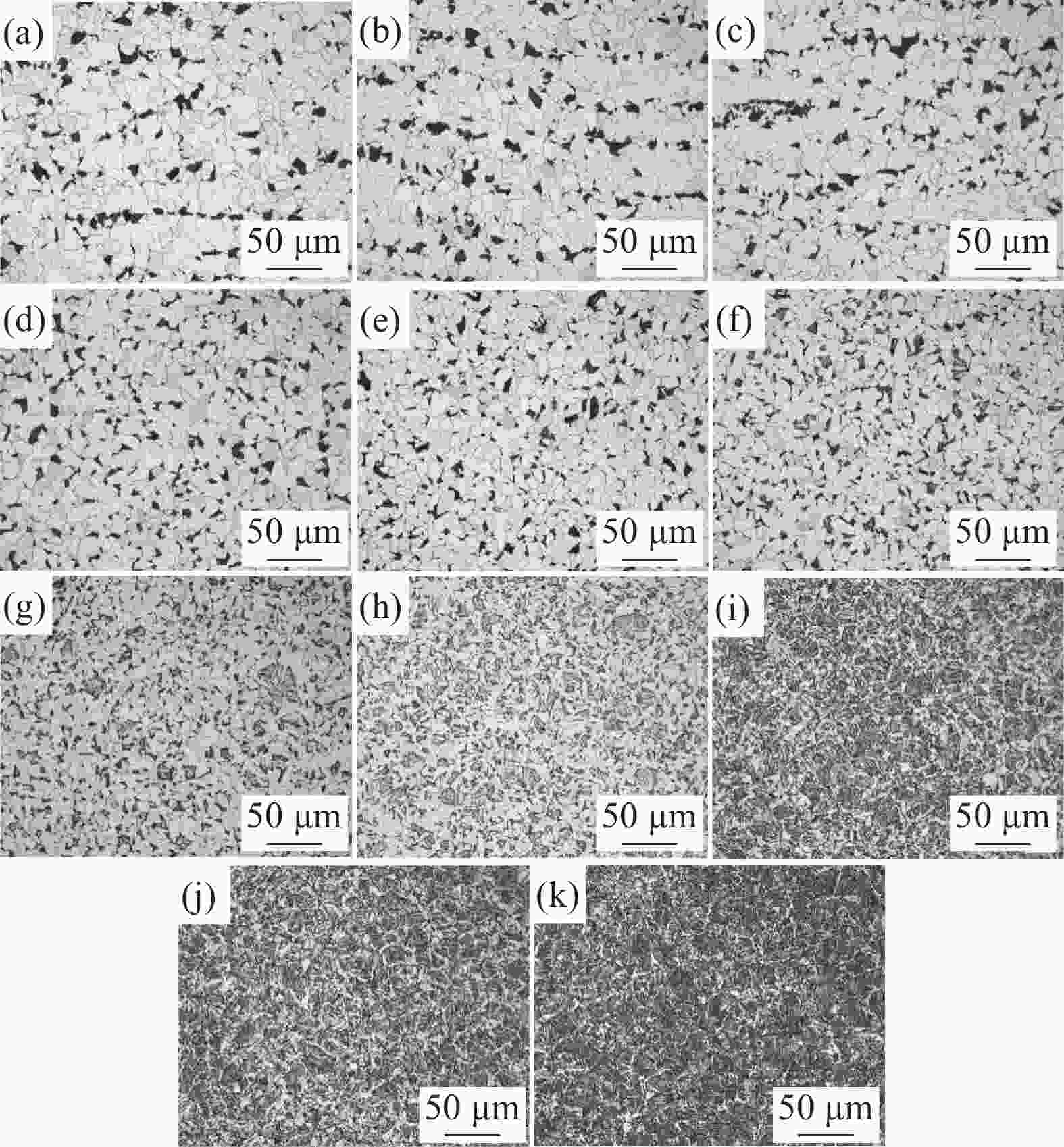 Abstract:The CCT curve of DP600 steel was measured and the steel was industrially produced under different laminar flow cooling processes. The effects of cooling rate, air cooling temperature, and coiling temperature on the microstructures and mechanical properties of the steel were studied. The results show that when the cooling rate is less than 10 °C/s, pearlite transformation occurs in DP600 steel. Bainite transformation occurs in DP600 steel when the cooling rate is ≥ 10 °C/s. And martensite transition occurs in DP600 steel when the cooling rate is higher than 20 ℃/s. As the air cooling temperature decreased from 700 ℃ to 620℃ and 500 ℃, the microstructures of the tested steel were ferrite/martensite, pearlite and bainite respectively, and the tensile strength decreased first and then increased. When the coiling temperature reduced from 500 ℃ to below 200 ℃, the microstructures changed from ferrite/pearlite to ferrite/martensite. When the coiling temperature was below 100 ℃, the morphology of martensite changed from diffusing distribution to banded segregation distribution, which in turn leads to the unqualified elongation and cold bending properties. When the air cooling temperature was 700 ℃ and coiling temperature was 200 ℃, the mechanical properties of DP600 steel met the requirements, with the microstructure of 75% ferrite and 25% martensite in volume fraction, the average grain size of (8.5±0.3) μm, the yield strength of (397±9) MPa, the tensile strength of (659±13) MPa, and the elongation rate of 27%±1.1%.