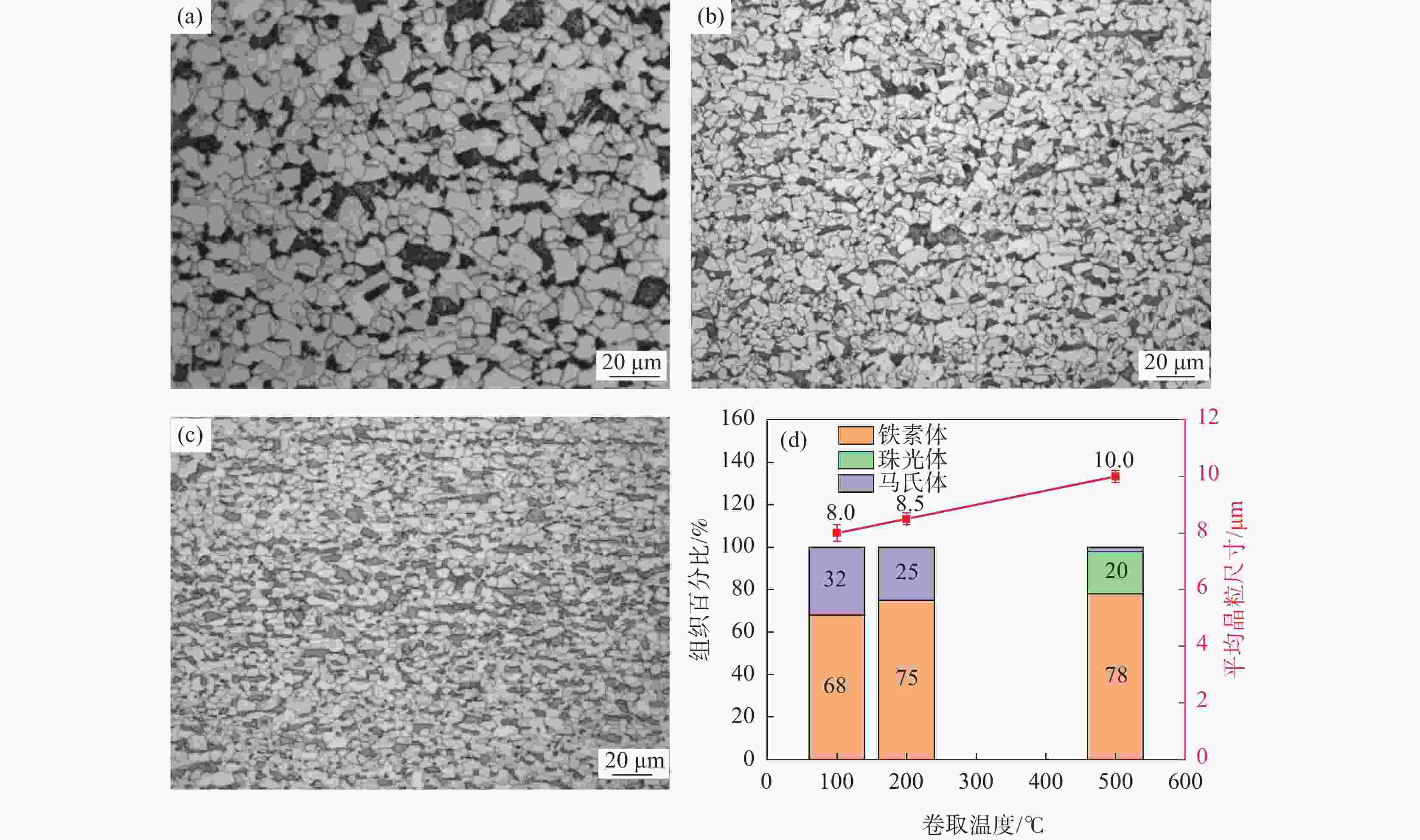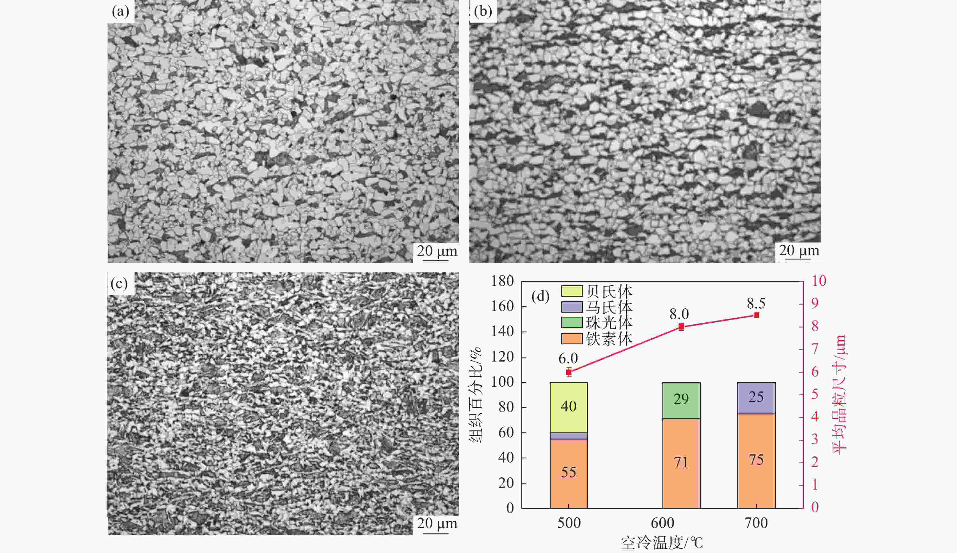 工艺 温度/℃ 冷却速率/(℃·s−1) 终轧 空冷 卷取 第一段 第二段 1 820 700 200 15.9 49.7 2 820 500 200 42.4 29.8 3 820 700 500 15.9 19.9 4 820 700 100 15.9 59.6 5 820 620 200 26.5 41.7 表 3 不同空冷温度、卷取温度条件下DP600试验钢的力学性能