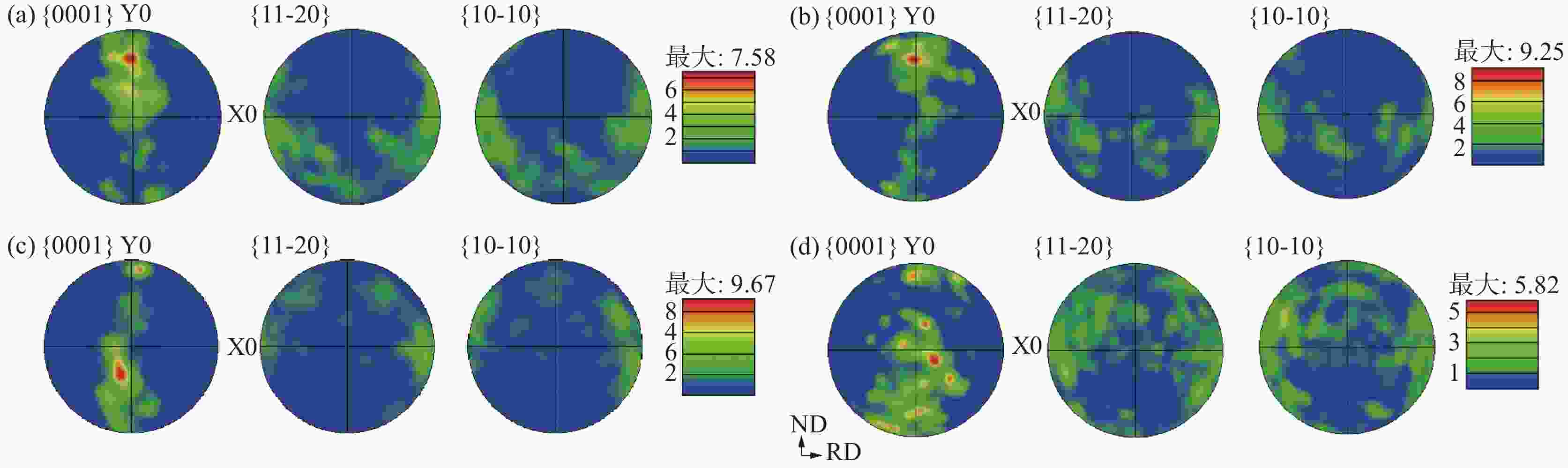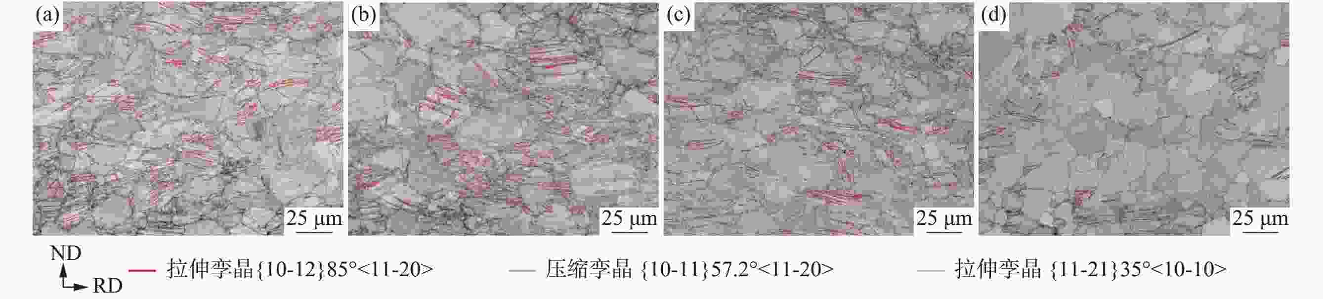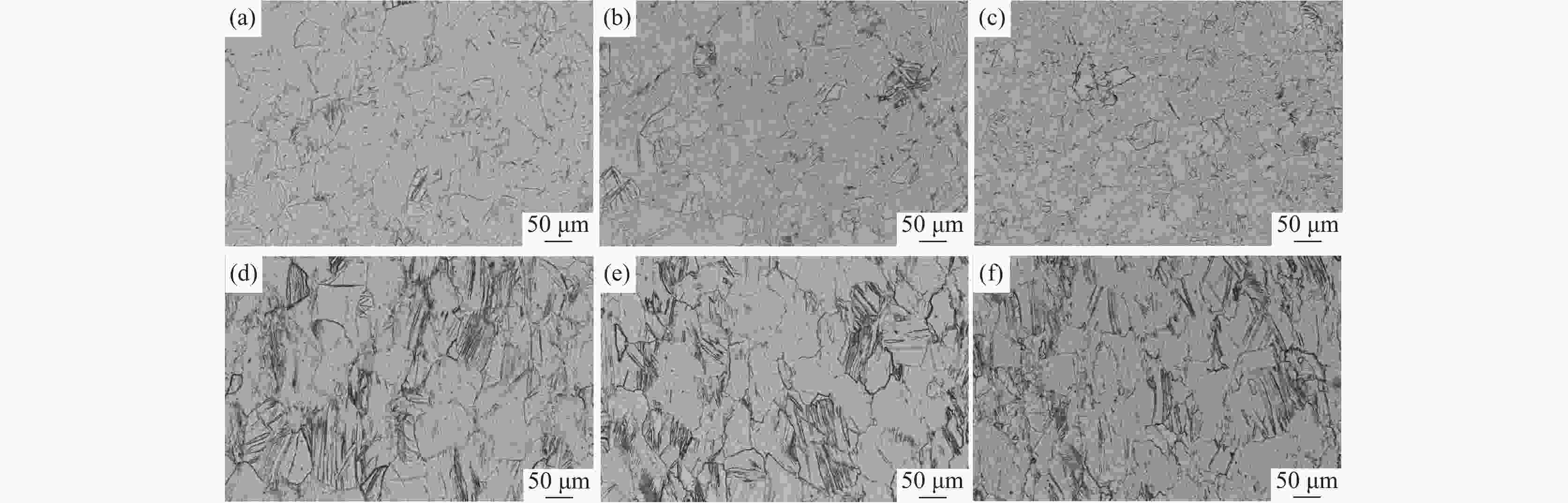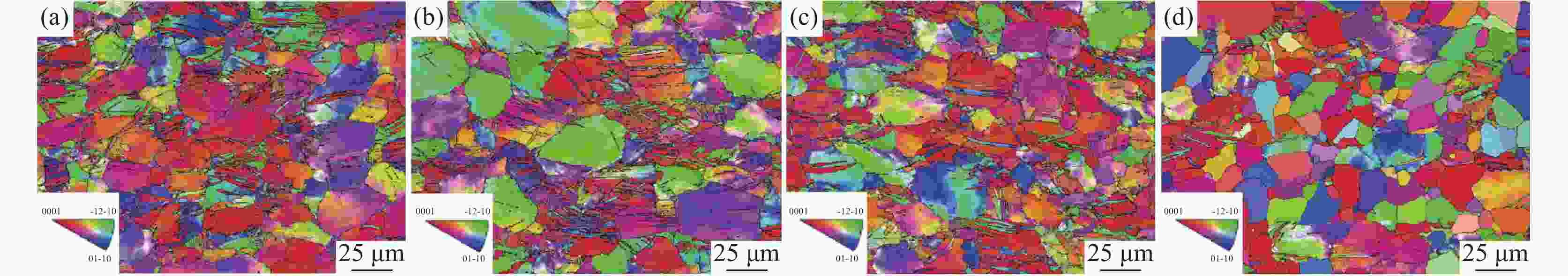摘要: 研究了热处理温度对Ø230 mm的TA16棒材微观组织、织构和力学性能的影响。结果表明:锻棒横纵向样原始组织为拉长的变形等轴组织,大晶粒内部分布着孪晶,横向样抗拉强度、屈服强度高于纵向样;随着退火温度的升高,横纵向样组织由拉长的变形晶粒逐渐趋于等轴化;原始锻态{10-12}拉伸孪晶含量最多,且随着热处理温度的升高,{10-12}拉伸孪晶在逐渐减少,当热处理温度升高至800 ℃时,孪晶完全消失,再结晶晶粒逐渐长大;原始锻态织构主要集中在{0001}//RD取向,与ND有一定夹角,当热处理温度升高至750 ℃时,织构强度降低,织构类型发生变化,集中在{0001}//ND取向,且与RD有一定夹角;且随着热处理温度的升高,横纵向样的抗拉强度、屈服强度、屈强比整体均呈下降趋势,延伸率逐渐升高。Abstract: The effect of heat treatment temperature on the microstructure, texture, and mechanical properties of Ø230 mm TA16 bar was studied. The results show that the original microstructure of the forged bar is an elongated and deformed equiaxed structure in both horizontal and vertical directions. Twin crystals are distributed inside the large grains. The tensile strength and yield strength of the transverse sample are higher than those of the longitudinal sample. With the heat treatment temperature increases, the transverse and longitudinal microstructures gradually shift from elongated deformed grains to equiaxed grains.The original forged {10-12} has the highest content of tensile twins, and as the heat treatment temperature increases, the {10-12} tensile twins gradually decrease. When the heat treatment temperature rises to 800 ℃, the twins completely disappear, and the recrystallized grains gradually grow. The original forged texture is mainly concentrated in the {0001}//RD orientation, with a certain angle with ND. When the heat treatment temperature rises to 750 ℃, the texture strength decreases and the texture type changes, concentrated in {0001}//ND orientation, with a certain angle with RD. As the heat treatment temperature increases, the overall tensile strength, yield strength, and yield ratio of the transverse and longitudinal samples show a decreasing trend, while the elongation gradually increases.