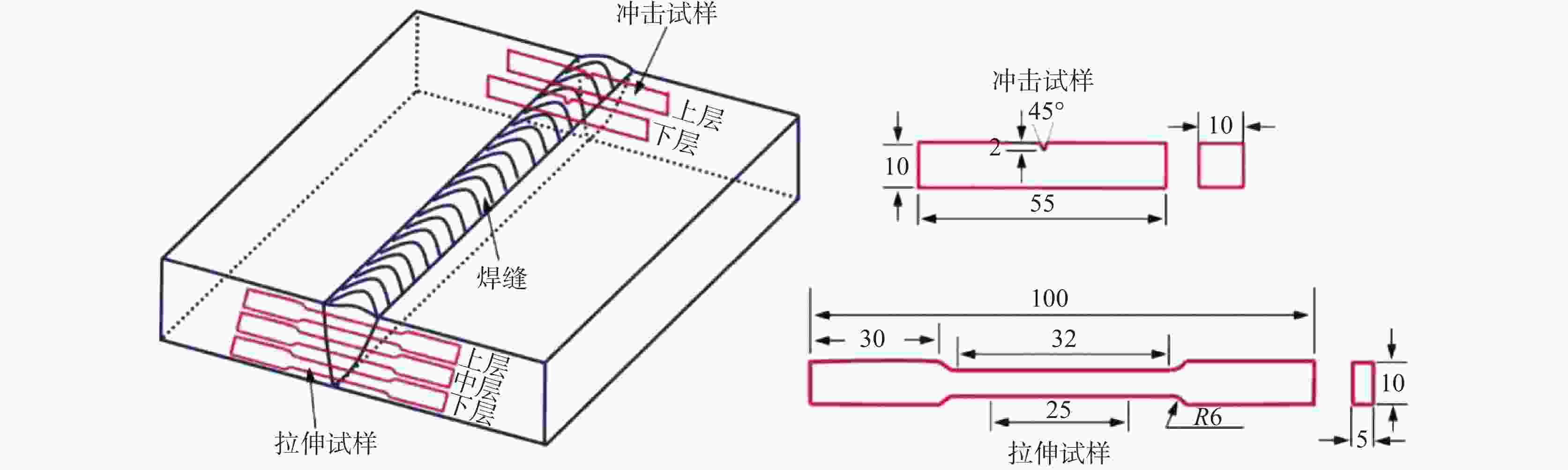 图  2  拉伸和冲击试样取样位置示意(单位:mm)