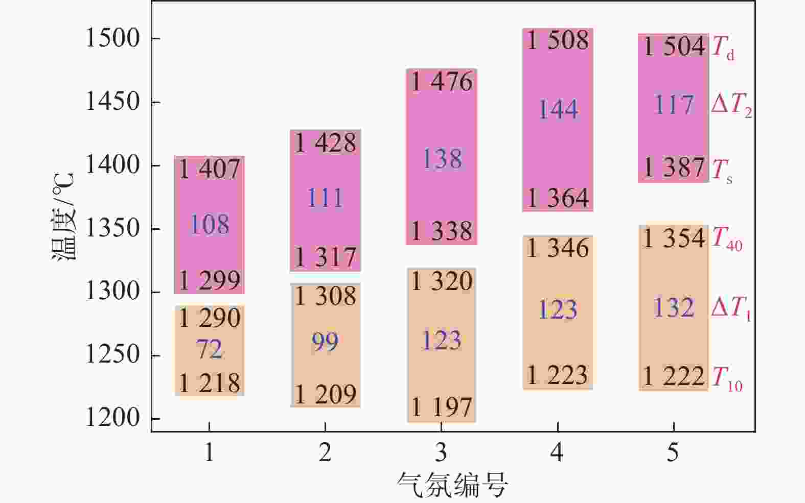 气氛编号 T10/℃ T40/℃ ΔT1/℃ TS/℃ TD/℃ ΔT2/℃ ΔPmax/kPa SD 1 1218 1290 72 1299 1407 108 19.05 1179.45 2 1209 1308 99 1317 1428 111 10.24 689.96 3 1197 1320 123 1338 1476 138 4.93 430.97 4 1223 1346 123 1364 1508 144 3.18 299.31 5 1222 1354 132 1387 1504 117 2.47 208.03 表 5 不同气氛条件下熔滴试验后炉渣化学成分