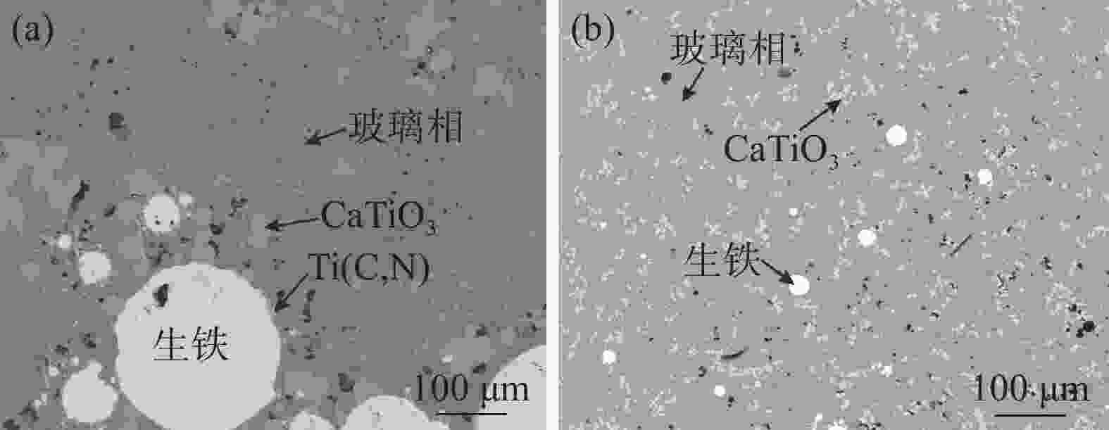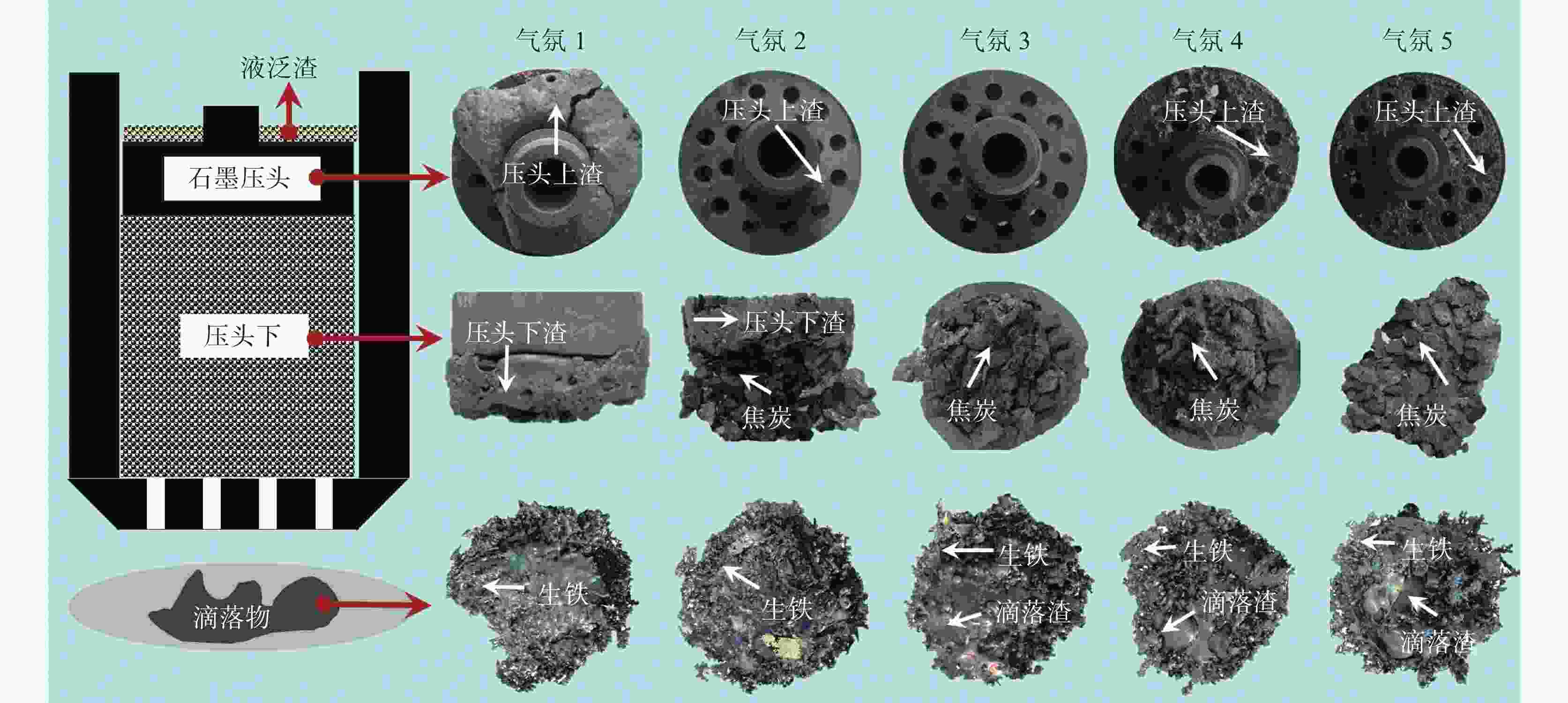 气氛序号 样品部位 MFe/% 渣成分/% FeO Al2O3 CaO MgO SiO2 TiO2 V2O5 Ti(C,N) R2 1 压头上渣 4.20 5.43 11.75 29.26 6.15 22.26 22.24 1.09 1.82 1.31 2 压头上渣 2.50 3.77 12.23 29.57 6.79 22.72 22.60 1.08 1.24 1.30 4 压头上渣 3.40 4.86 12.70 28.42 7.23 21.86 21.52 0.95 2.46* 1.30 5 压头上渣 2.30 3.30 13.14 28.11 7.70 21.46 21.41 0.85 4.04* 1.31 1 压头下渣 26.40 7.60 11.04 27.34 6.92 20.89 21.88 1.09 3.24 1.31 2 压头下渣 21.50 6.07 11.51 27.52 8.51 20.87 22.52 1.03 1.98 1.32 3 滴落渣 1.90 3.94 12.88 27.92 9.41 21.37 23.59 0.76 0.12* 1.31 4 滴落渣 4.30 2.56 12.67 27.72 9.58 21.52 23.56 0.64 1.73* 1.29 5 滴落渣 6.30 2.13 13.06 28.14 9.13 21.32 23.53 0.62 2.07* 1.32 注:*样品仅存在TiC,无TiN存在。 表 6 不同气氛条件下熔滴试验后滴落铁化学成分