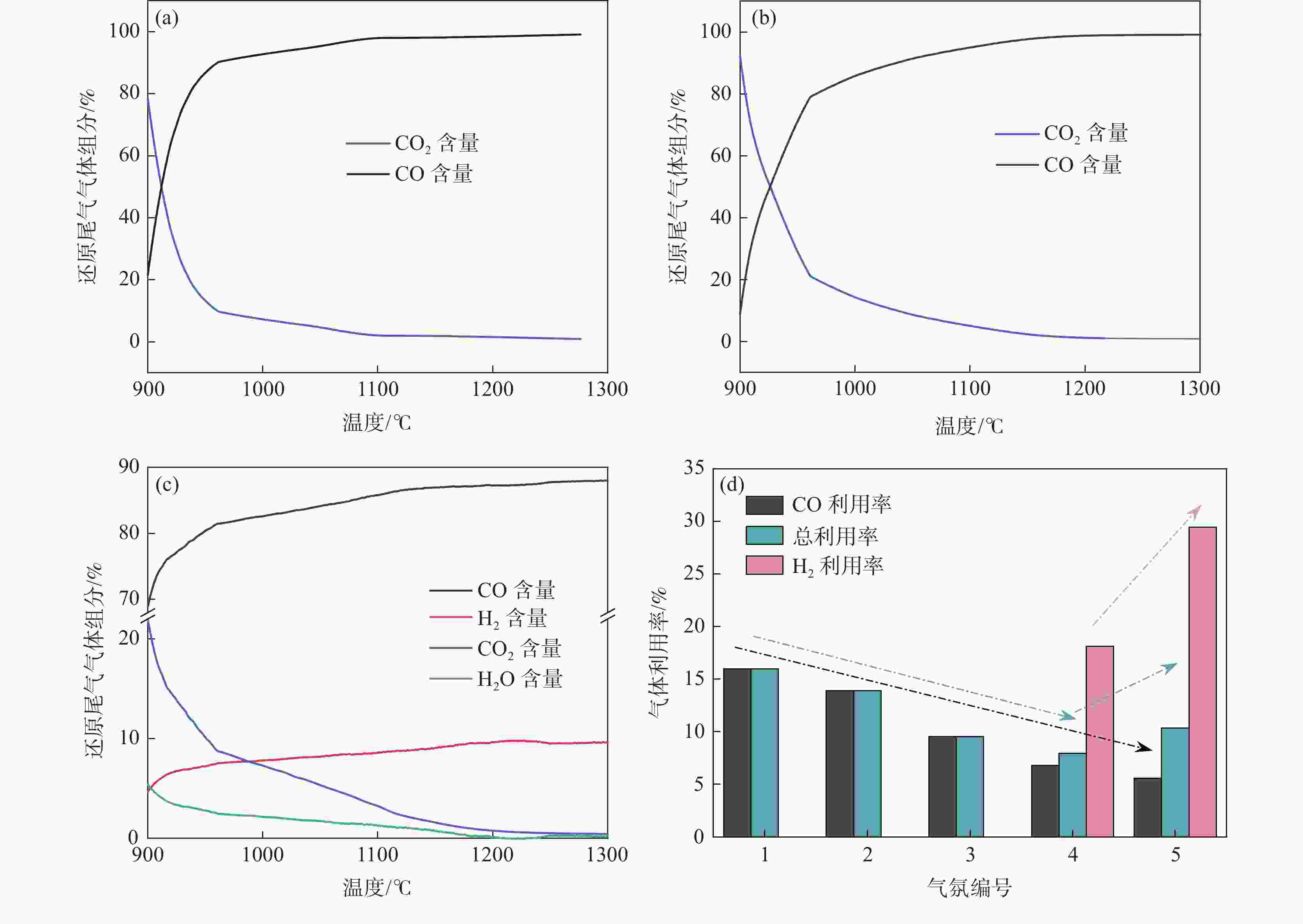 % 编号 N2 CO H2 普通高炉气氛 1 70 30 0 富氧高炉气氛 2 35 65 0 全氧高炉气氛 3 0 100 0 全氧高炉富氢气氛 4 0 90 10 5 0 80 20 表 4 不同气氛下钒钛混合炉料软熔试验特征参数