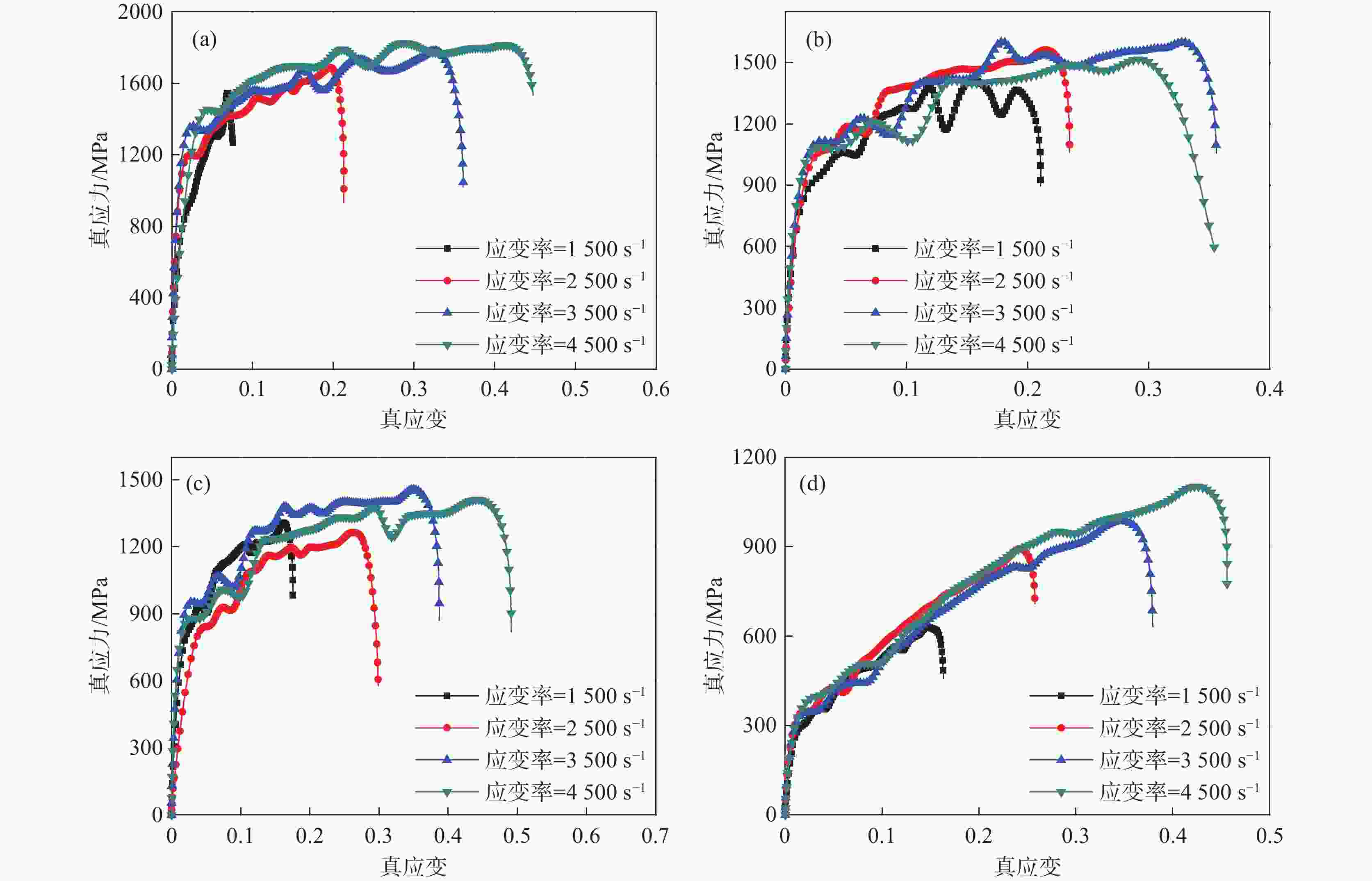 (a) $ \dot{\varepsilon}=1\ 500\text{ }\text{s}^{-1} $; (b) $ \dot{\varepsilon}=2\ 500\text{ }\text{s}^{-1} $; (c) $ \dot{\varepsilon}=3\ 500\text{ }\text{s}^{-1} $ ; (d) $ \dot{\varepsilon}=4\ 500\text{ }\text{s}^{-1} $