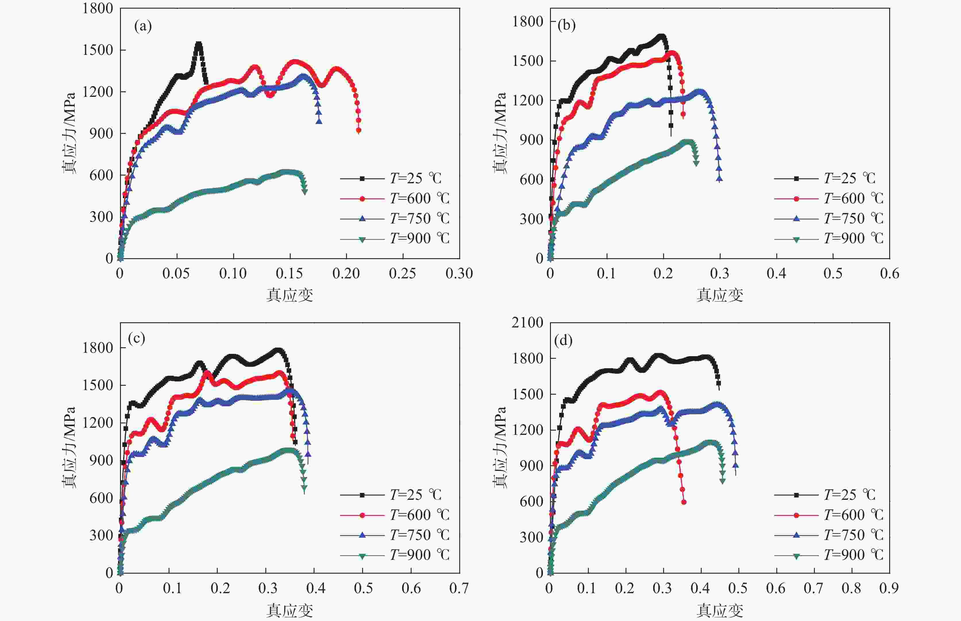 黑色:25℃;红色:600℃;蓝色:750℃;紫色:900℃(a)$ \dot{\varepsilon}=1\ 500\text{ }\text{s}^{-1} $ ; (b) $ \dot{\varepsilon}=2\ 500\text{ }\text{s}^{-1} $;(c) $ \dot{\varepsilon}=3\ 500\text{ }\text{s}^{-1} $ ; (d) $ \dot{\varepsilon}=4\ 500\text{ }\text{s}^{-1} $