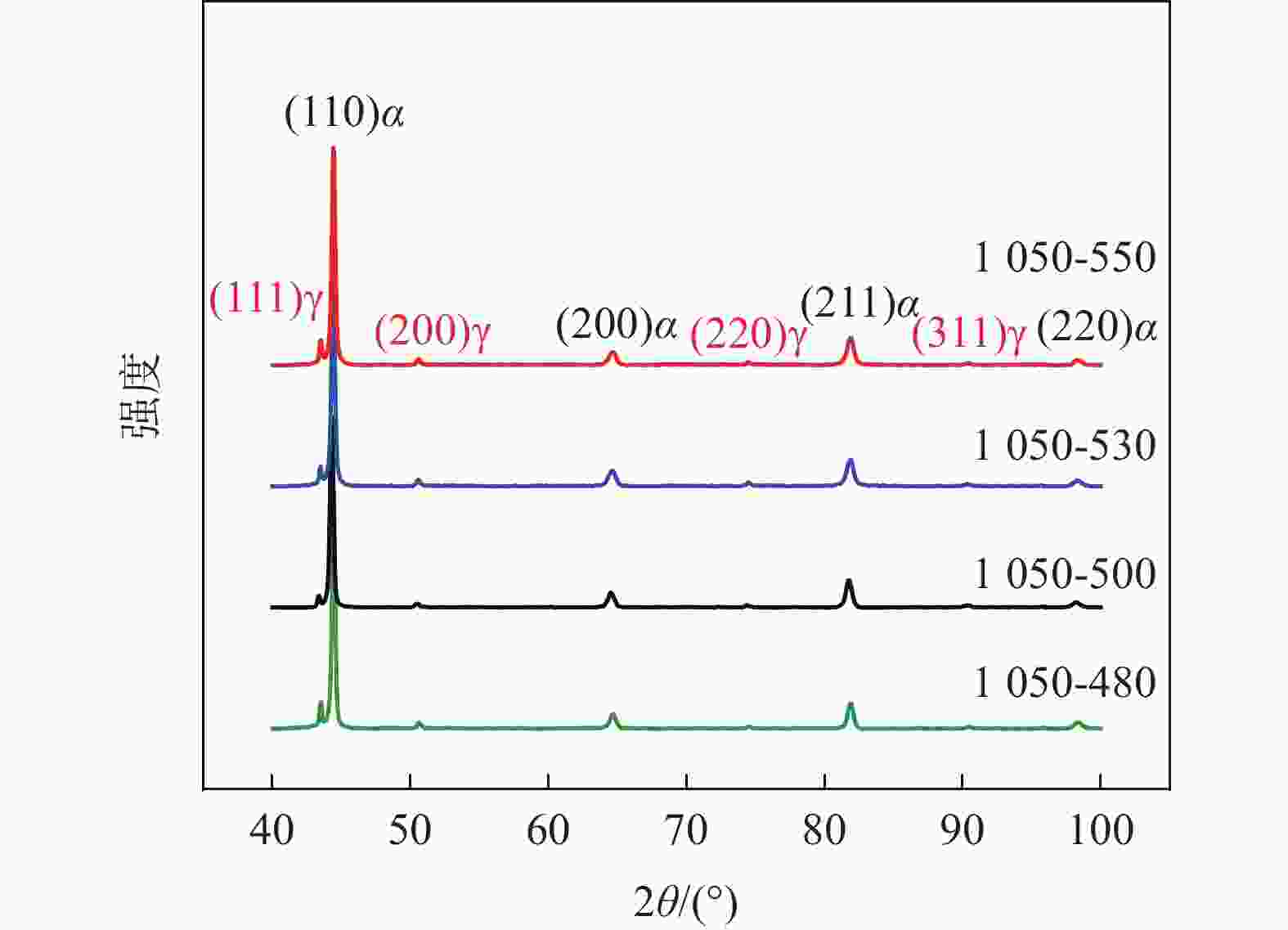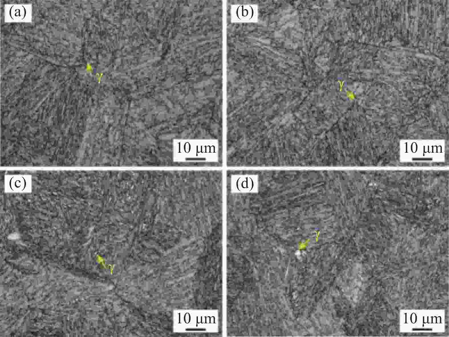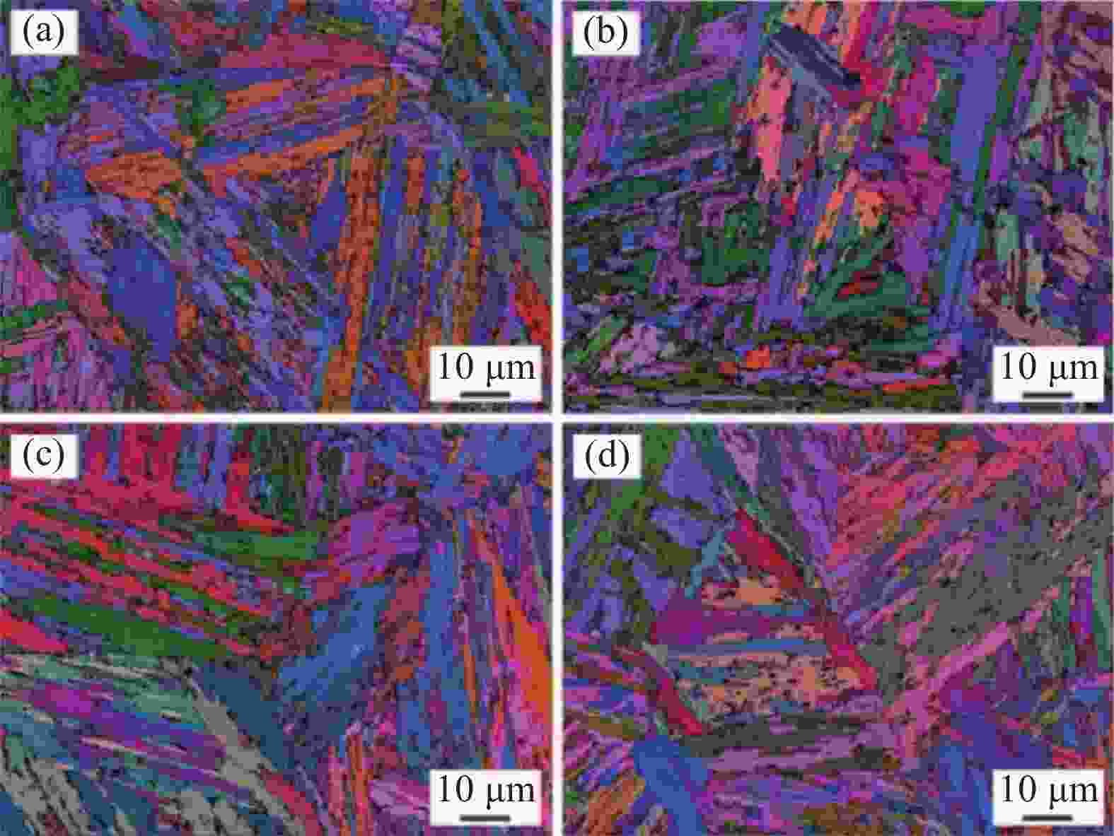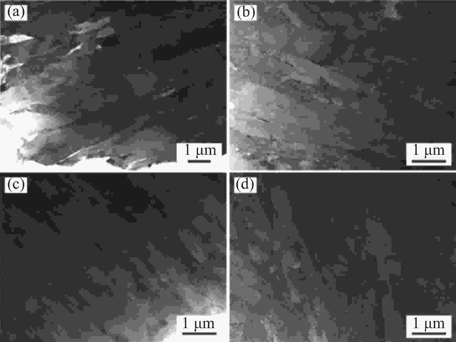 样品名称 平均长度 /μm 平均宽度 /μm 长宽比 1050 -48018.3 2.9 6.3 1050 -50019.6 2.9 6.8 1050 -53017.1 3.8 4.5 1050 -55014.4 3.5 4.1 表 3 马氏体板条的平均尺寸