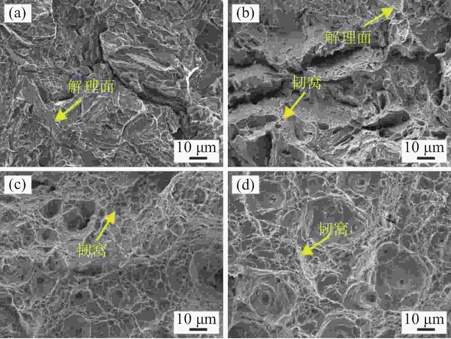 1050 -480、1050 -500、1050 -530和1050 -550样品中Ni3Ti析出相长度分别为11.5、7.9、15.9 nm和33.1 nm,宽度分别为2.8、2.8、4.3 nm和7.8 nm。随析出相尺寸的增大,析出相分布逐渐变得稀疏,高钛马氏体时效不锈钢拉伸强度逐渐降低,塑性逐渐增大,拉伸断裂特征从脆性解理断裂向韧性韧窝断裂转变。-