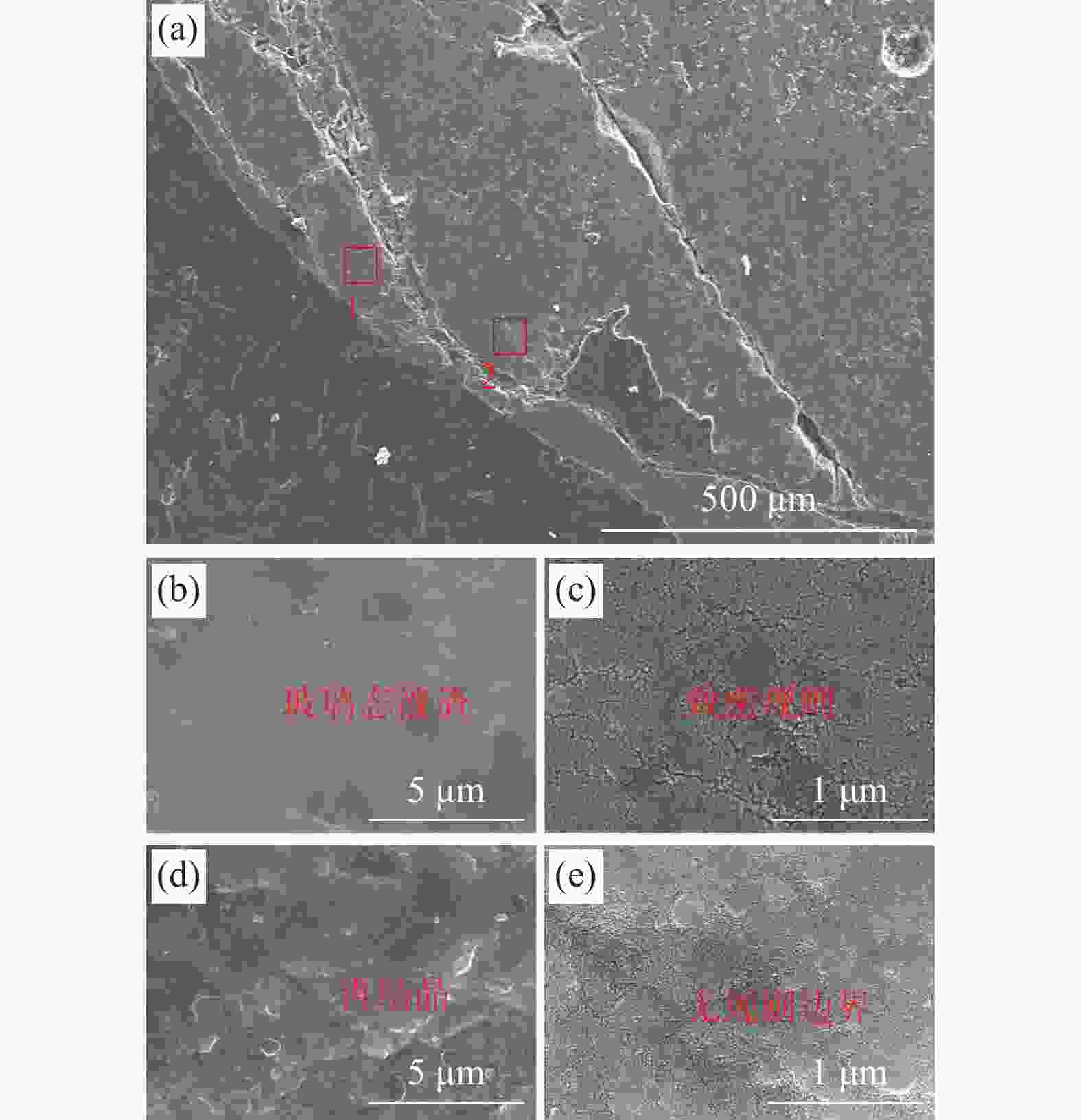 (a)靠近器壁处形貌;(b)(c)区域1;(d)(e)区域2