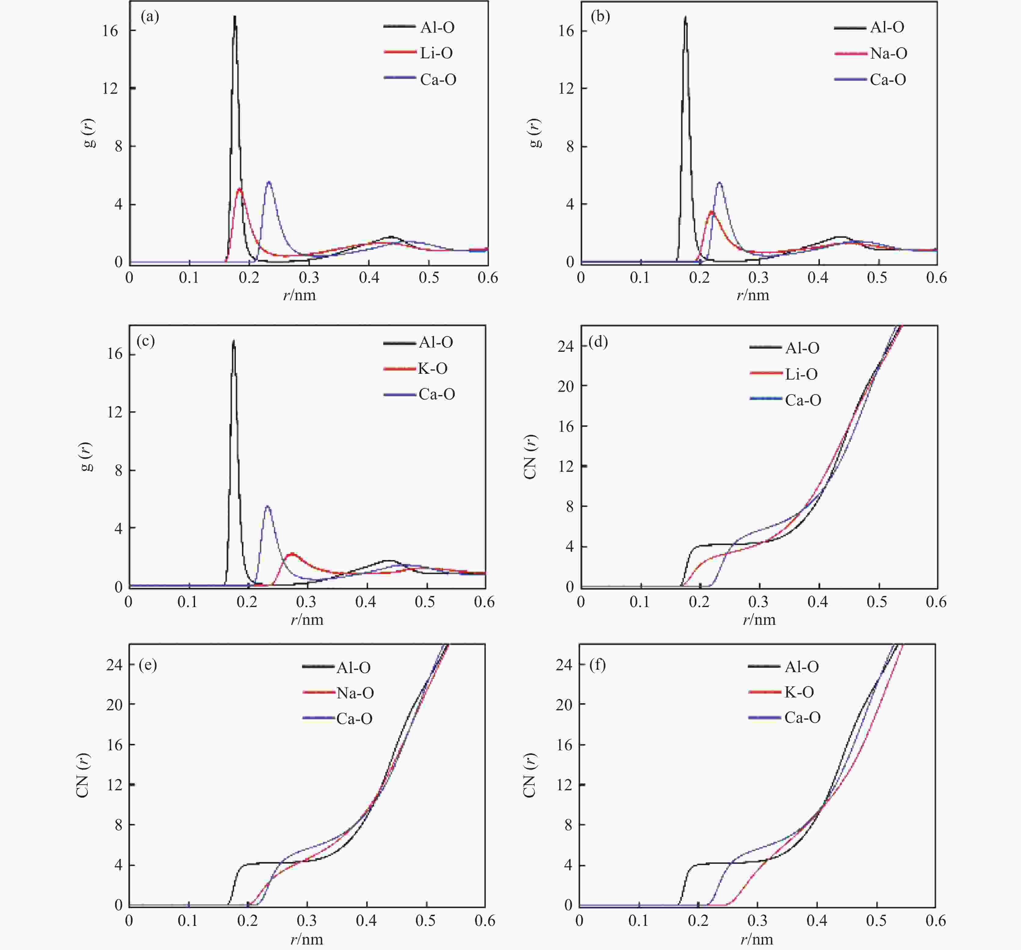 偏径向分布函数:(a)CaO-Al2O3-Li2O;(b)CaO-Al2O3-Na2O; (c)CaO-Al2O3-K2O  配位数曲线: (d) CaO-Al2O3-Li2O; (e) CaO-Al2O3-Na2O; (f) CaO-Al2O3-K2O