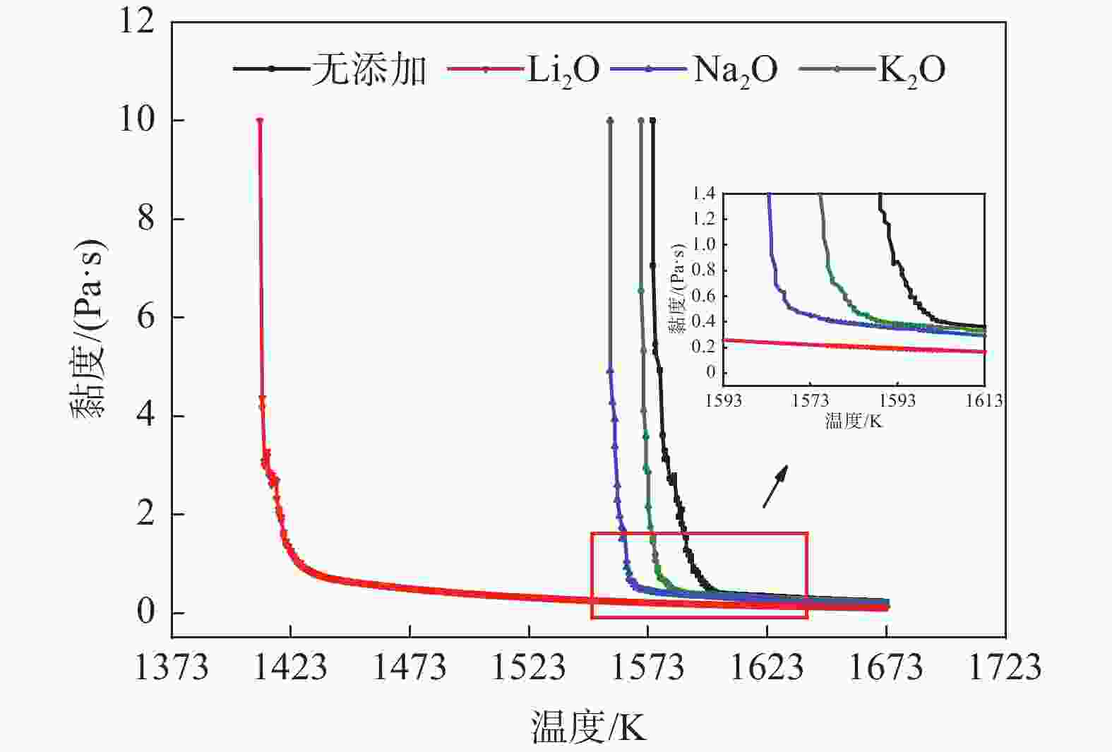 图  8  不同碱性氧化物对CaO-Al2O3保护渣黏度-温度曲线的影响