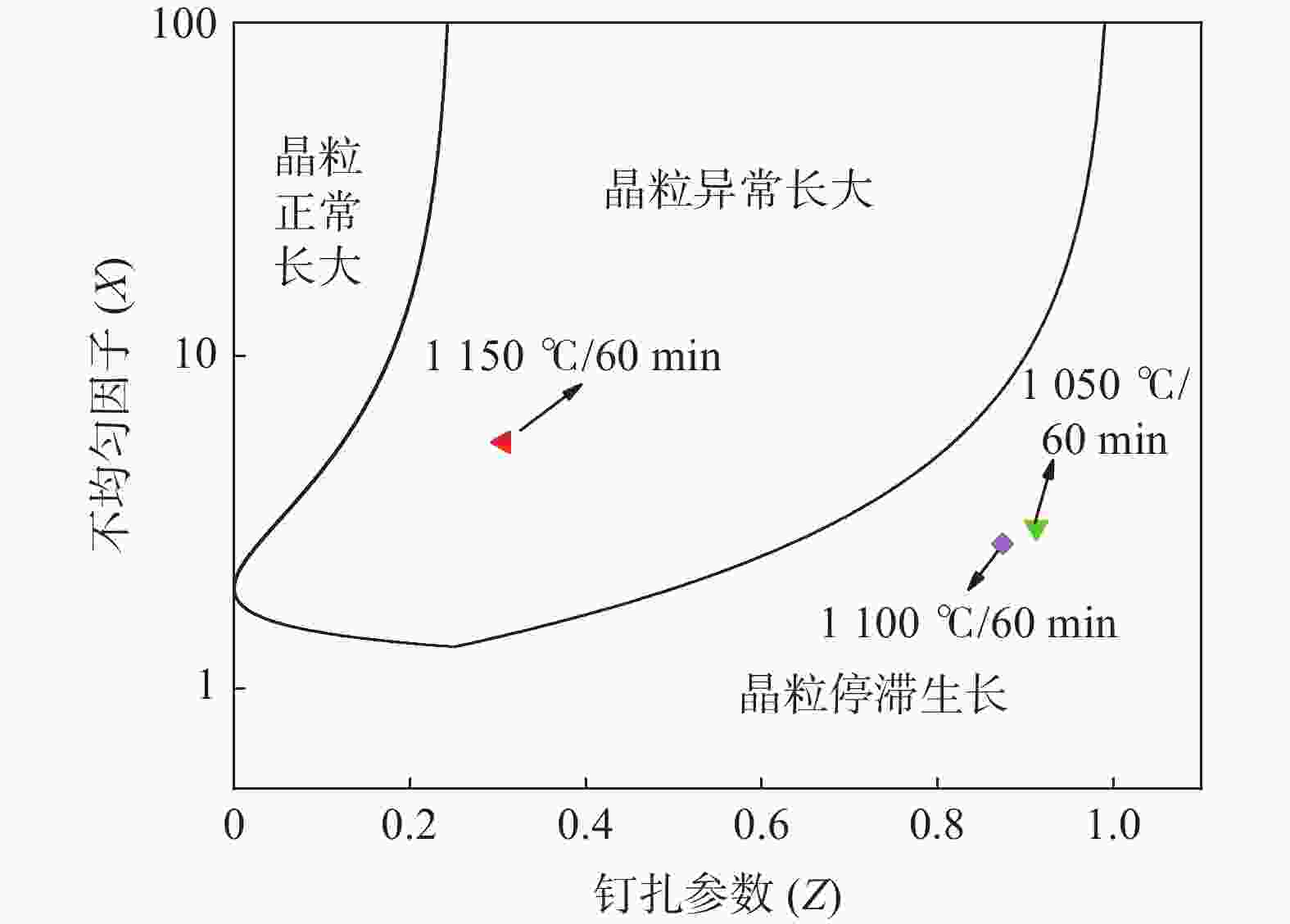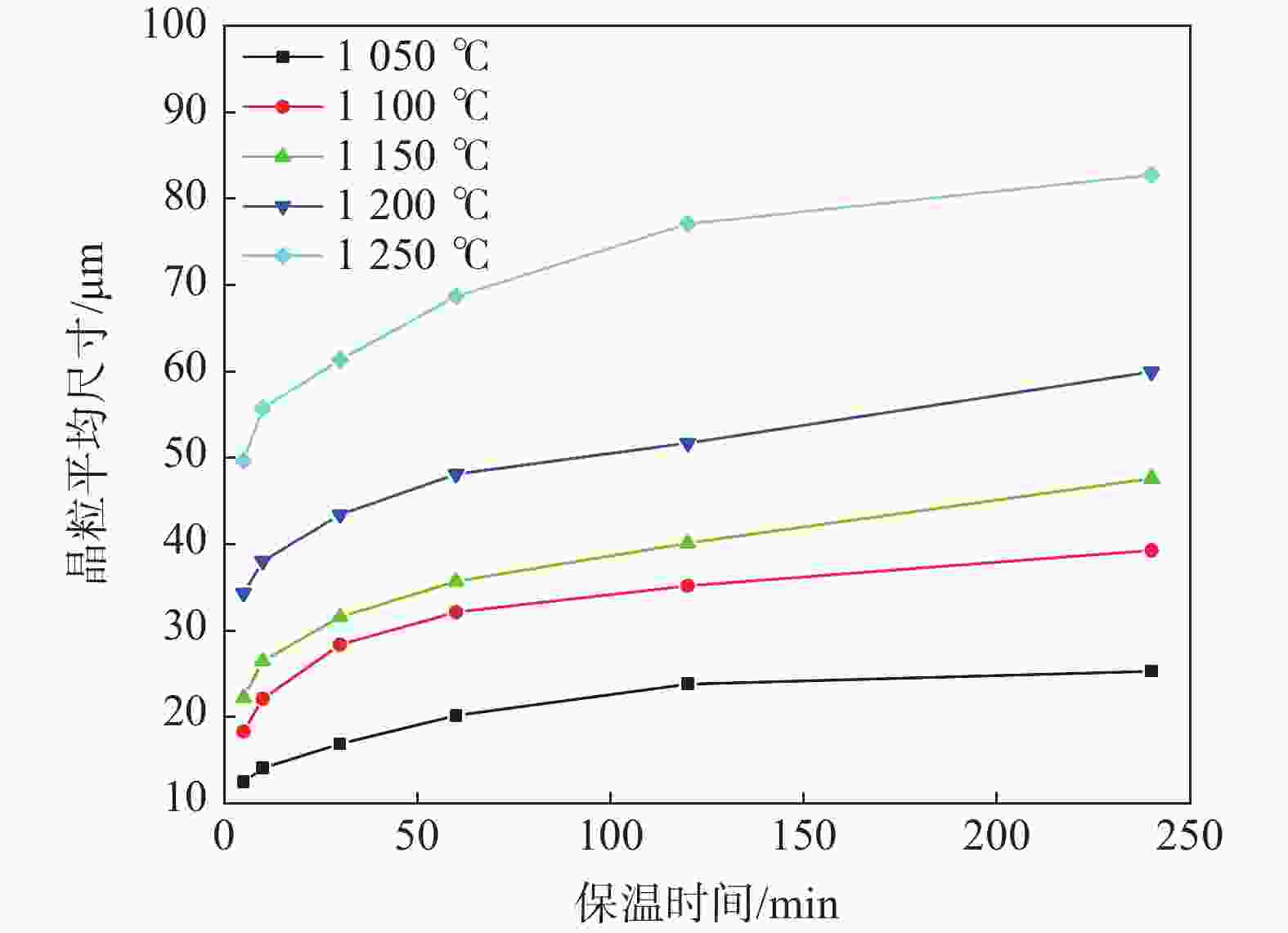 加热温度/℃ 保温时间/min 不均匀因子 平均晶粒直径/μm 析出相直径/nm 1050 30 3.05 20.16 18.56 1100 30 2.72 32.13 23.16 1150 30 5.5 35.69 36.69 1200 30 3.89 48.13 68.83 1250 30 2.29 63.61 0 -