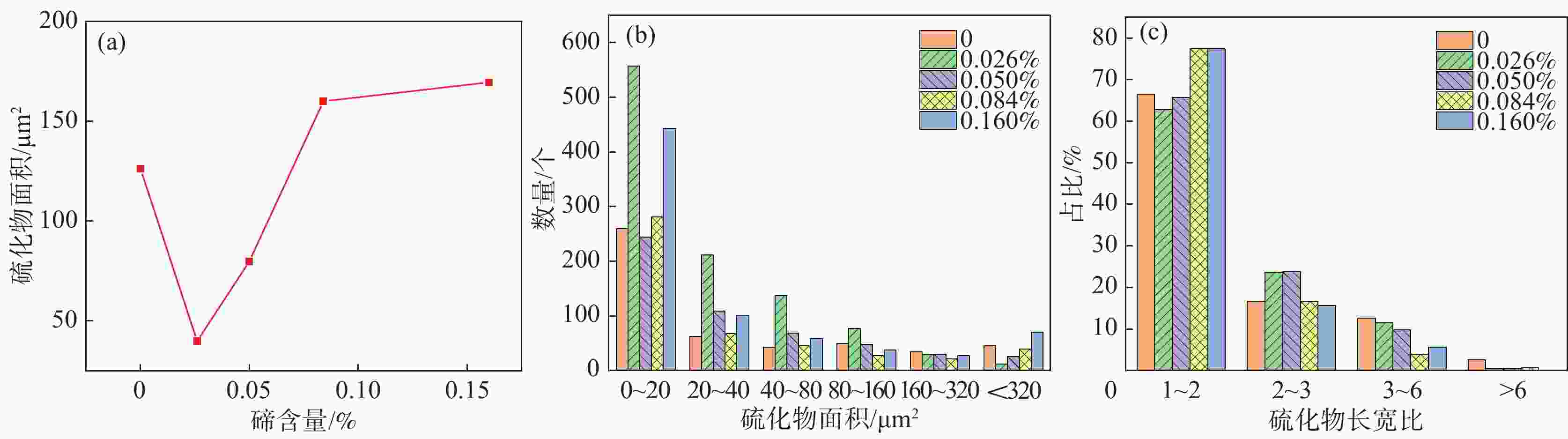 (a) 平均面积;(b)面积分布;(c)长宽比分布