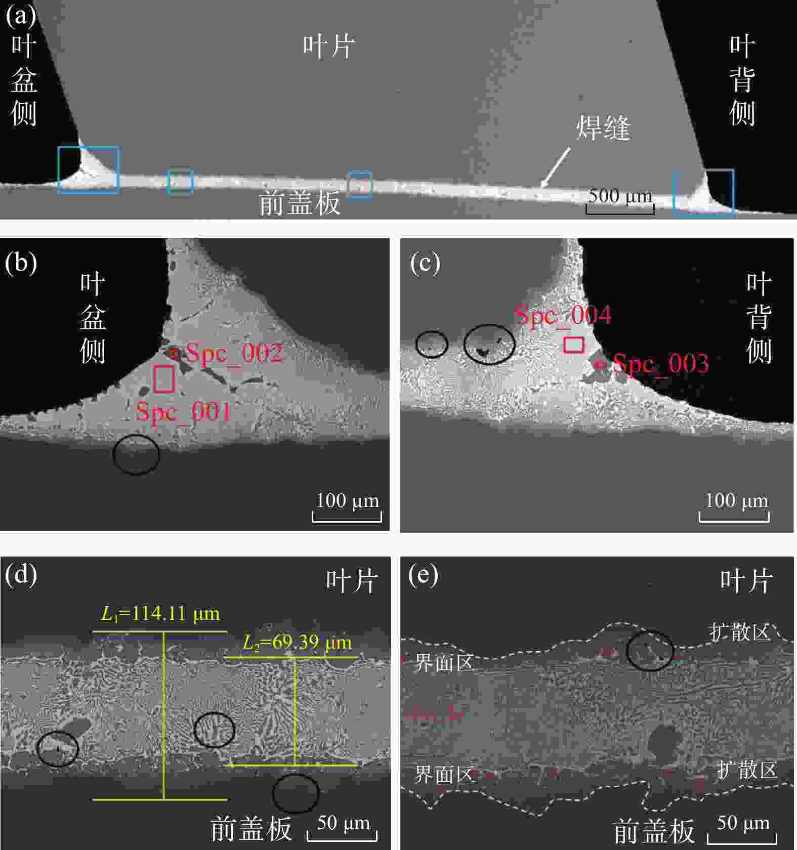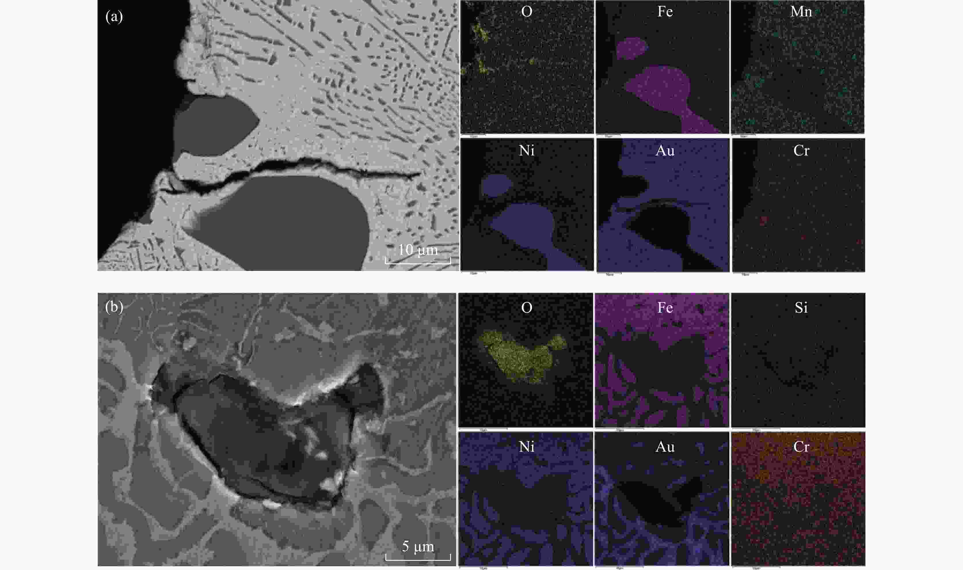 % 分析位置 C O Si Cr Mn Fe Ni Au Spc_001 6.46 1.98 1.88 1.42 7.30 7.77 73.19 Spc_002 4.92 2.75 29.17 52.61 10.55 Spc_003 6.99 1.77 3.57 29.04 44.64 14.01 Spc_004 6.17 1.85 2.00 1.10 10.52 10.01 68.35 表 4 EDS分析结果