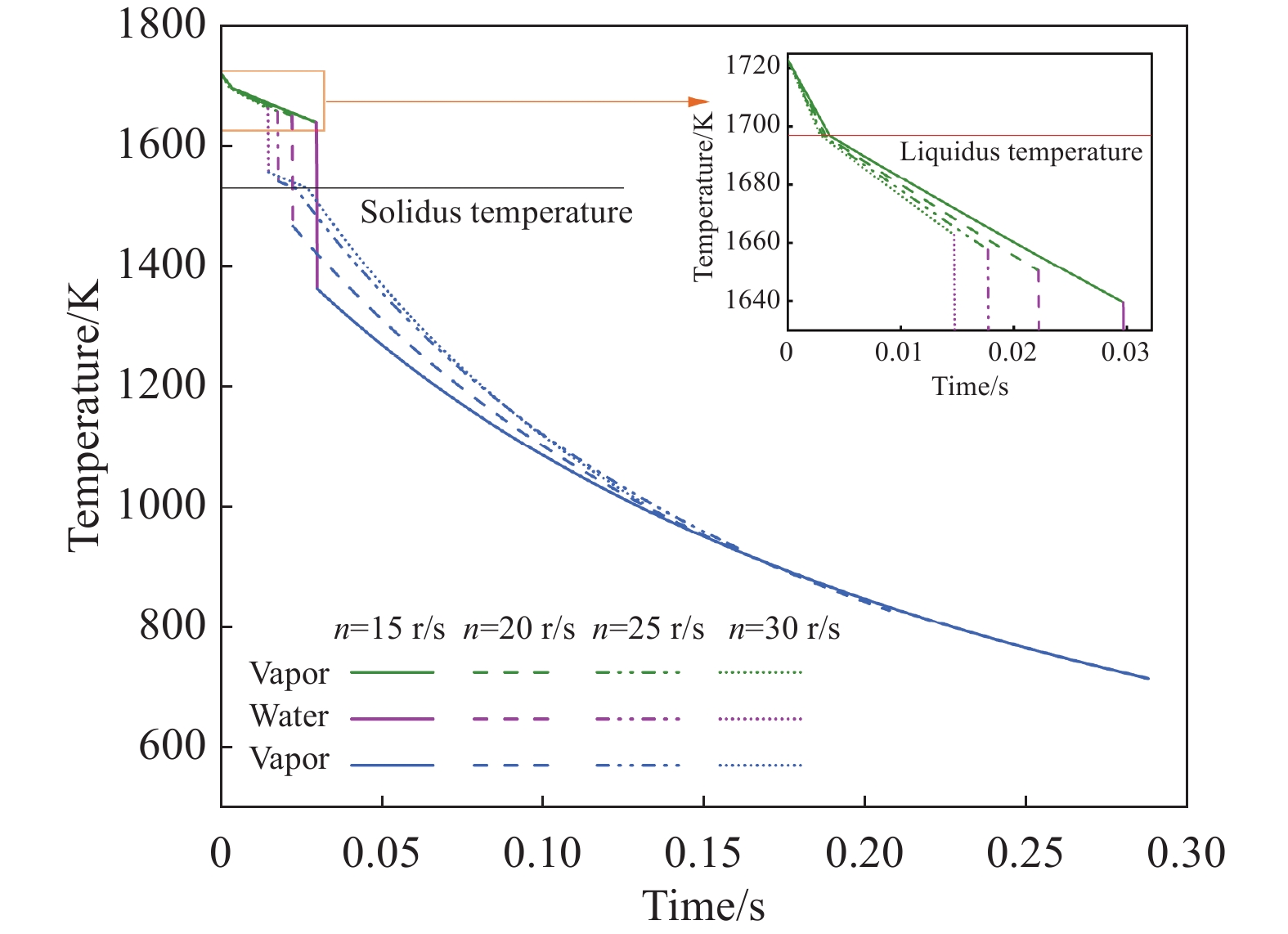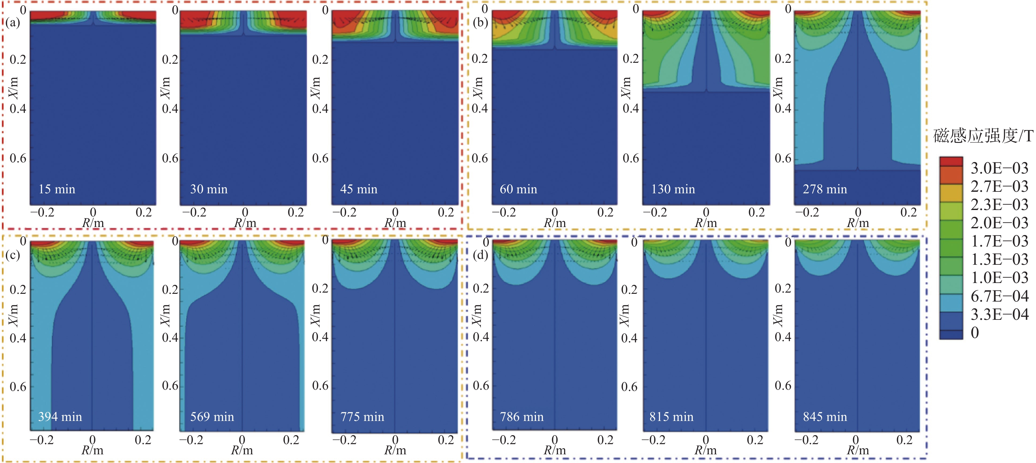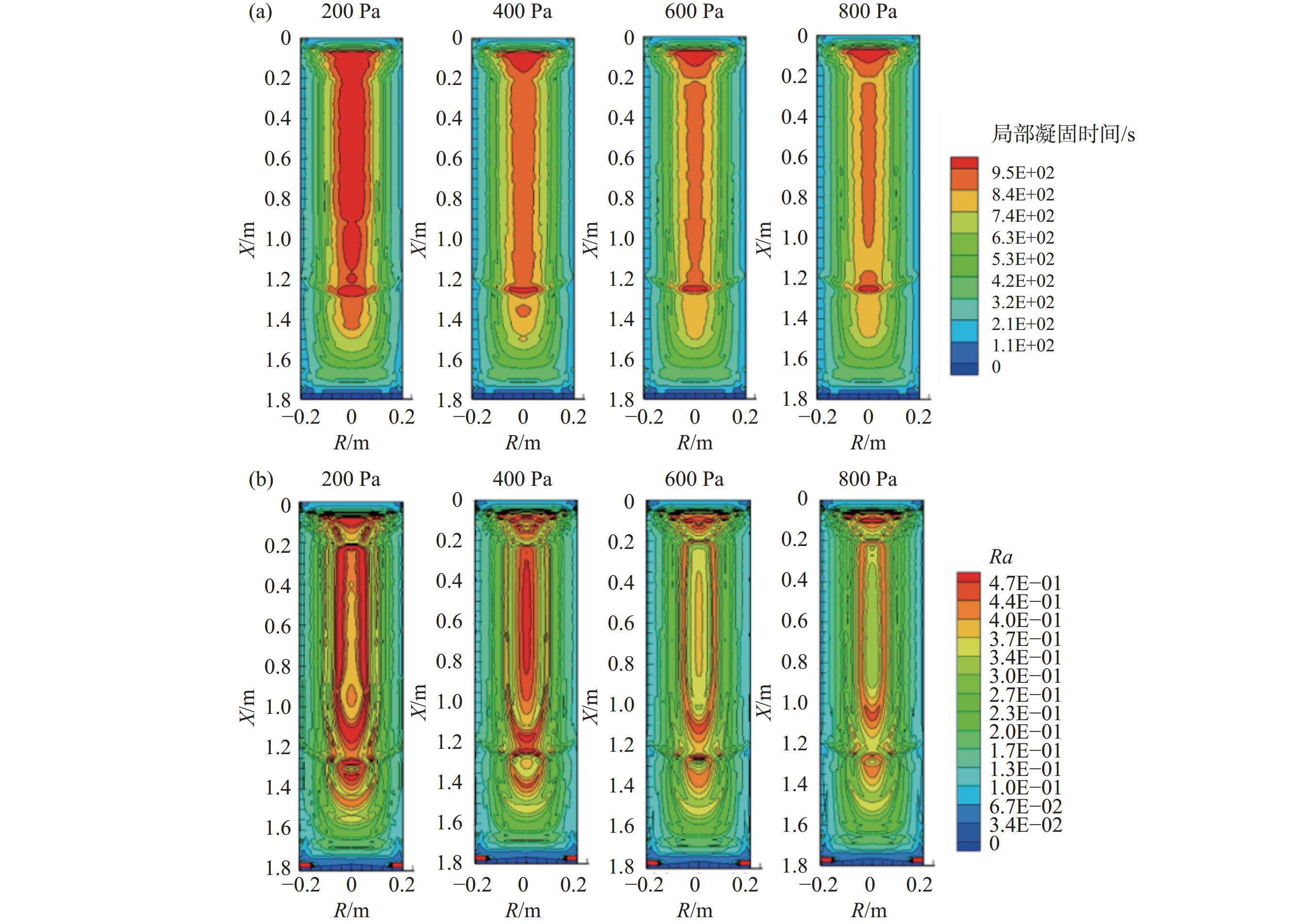 In this paper, the numerical simulation on vacuum arc remelting process of nickel base superalloy with respect to electromagnetic distribution, flow and heat transfer behavior of molten pool, as well as the morphology and size at different stages of the vacuum arc remelting process had been carried out by using a Meltflow-VAR software. Moreover, the formation tendency and reasons for the freckle defects throughout the smelting process had been investigated. At the same time, the influence of helium pressure on the flow and heat transfer behavior of molten pool, the morphology and size of molten pool, and the freckle formation was studied. The results show that the potential is mainly located in the center of the surface of the ingot, while the magnetic induction intensity is mainly located at the edge of the surface of the ingot, as well as the flow of the molten pool is mainly driven by thermal buoyancy. In addition, the electric field strength, current density, Lorentz force as well as the size and flow intensity of the molten pool that distributed on the surface and inside of the ingot, gradually increase at the ignition process of vacuum arc, and remain stable during the steady-state stage, then gradually decrease during the hot tap stage. During the entire smelting process, the freckle defect easily forms near the top of the hot seal on the upper part of the ingot because the cooling effect of the bottom plate of the crystallizer is weak, the helium pressure at the top of the hot seal decreases and the holding time at low melting rates is long as the ingot grows in the longitudinal direction. Increasing helium pressure can reduce the size of the molten pool and alleviate ingot segregation, but the effect of improving ingot segregation defects will gradually become less significant as continuously increasing helium pressure. Finally, the comparison of molten pool depth observed by experimental dissection and simulation is conducted, which verifies the rationality of the established mathematical model.