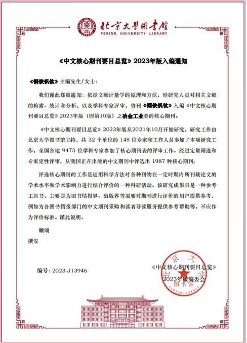 日前,《钢铁钒钛》编辑部收到北京大学图书馆通知,《钢铁钒钛》入编《中文核心期刊要目总览》2023年版(即第10版)冶金工业类中文核心期刊。这是《钢铁钒钛》自2004年至今第七次入编。